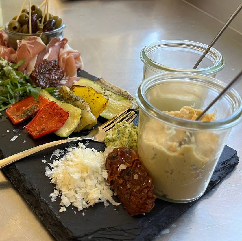 Frisch gegrilltes Gemüse – fein mariniert und auf den Punkt zubereitet mit Humus, Aioli und Oliven.