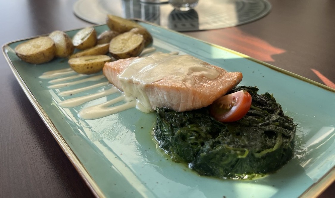 Lachssteak 200g / Spinat in Knoblauch / Weißweinsauce / Rosmarinkartoffeln